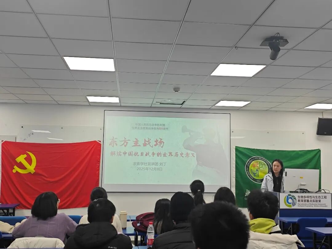 2025年12月8日晚,为纪念中国人民抗日战争暨世界反法西斯战争胜利80周年,学习习近平总书记相关重要讲话精神,求实党支部主题党日活动在生态所A105教室举行。活动与25级本科1班团支部、25级强基团支部和24级励耘团支部共办,邀请求索宣讲团讲授《东方主战场:解读抗日战争的世界历史意义》专题课,并开展了“抗战历史、抗战精神”主题研讨,49名同学在庄重氛围中回望历史、感悟精神。