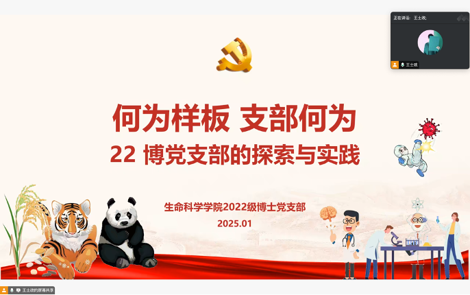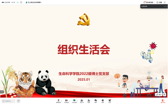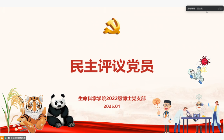 2025年1月10日晚19:00,生命科学学院2022级博士党支部线上进行组织生活会,并开展民主评议党员工作,全体党员(包括预备党员)参会。会议由支部书记王士政主持。