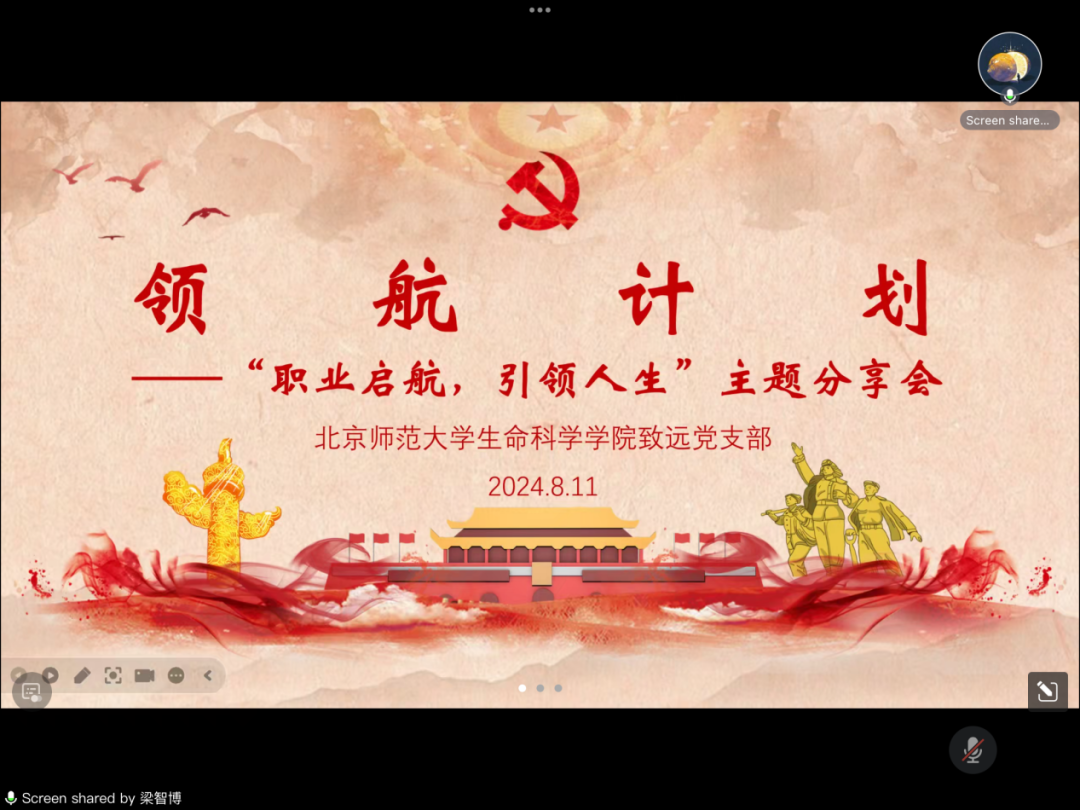 为给予同学们职业规划的启发,明晰未来奋斗方向,2024年8月11日,致远党支部开展“领航计划”系列讲座——“职业启航,引领人生”主题分享会,本期“领航计划”邀请了两位2024届生物科学专业本科毕业生——刘易承与玛妮亚·别尔等别克为同学们分享他们的求职经历与心得,期望在本次主题分享会上与各位同学一起交流经验,展望未来。
