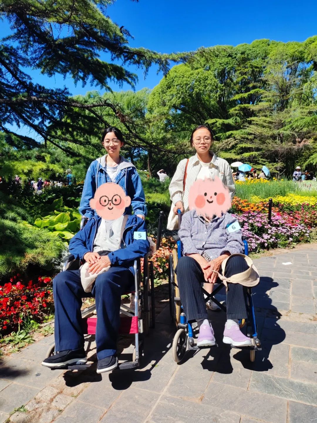 我们起的非常早,还没吃早饭就骑车来到了老年公寓,开始一上午的志愿工作。我对接的是一位爷爷,我问了他高寿,居然已经九十了!经过了解,其他爷爷奶奶们都是九十多岁,我感到非常荣幸能够帮助他们进行春游。在推轮椅的过程中,虽然很热,爷爷担心我不方便,强烈要求下车自己走。我们一起聊了很多,最后还留下了合影。虽然跟爷爷奶奶只有一两个小时的缘分,但是好像已经有了很深的交情了。听说爷爷奶奶的孙子都已经三十多,而且有孩子了,已经是四世同堂,这也让我想到了自己的爷爷奶奶。此外,我们和奶奶们牵着手走路、聊天,奶奶还帮志愿者拍照,在阳光下,画面简直太美好了,我都忍不住给她们拍了好多照片。其实感觉这里的爷爷奶奶身体都还很硬朗,一定会特别特别长寿!下次我还来跟爷爷奶奶们出去玩!