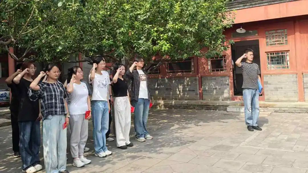 为贯彻落实“深入贯彻中央八项规定精神学习教育”部署计划,感悟革命年代艰苦奋斗精神。2025年6月29日,在七一建党节到来之际,笃行党支部组织党员们前往北京李大钊故居参观学习,通过参观李大钊同志生平事迹,感悟中国共产党成立的艰辛与不易。同时,笃行党支部联合立身党支部和励学党支部,在李大钊同志庭院为新发展党员举行入党宣誓仪式,以示对他们获得的党员身份的庄严认可。