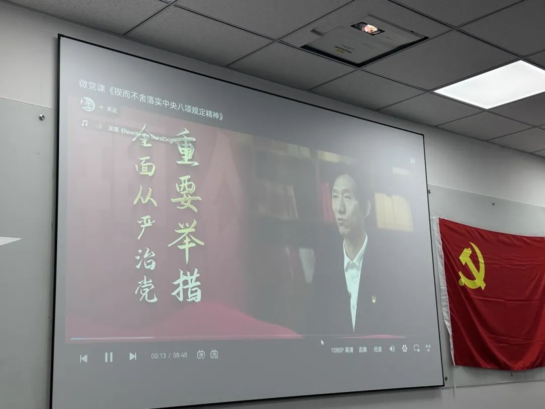 同时,支部还组织大家观看了微党课《锲而不舍落实中央八项规定精神》,让党员直观感受到了党中央一以贯之、锲而不舍的鲜明态度,也增强了党员同志们的纪律意识和敬畏之心。