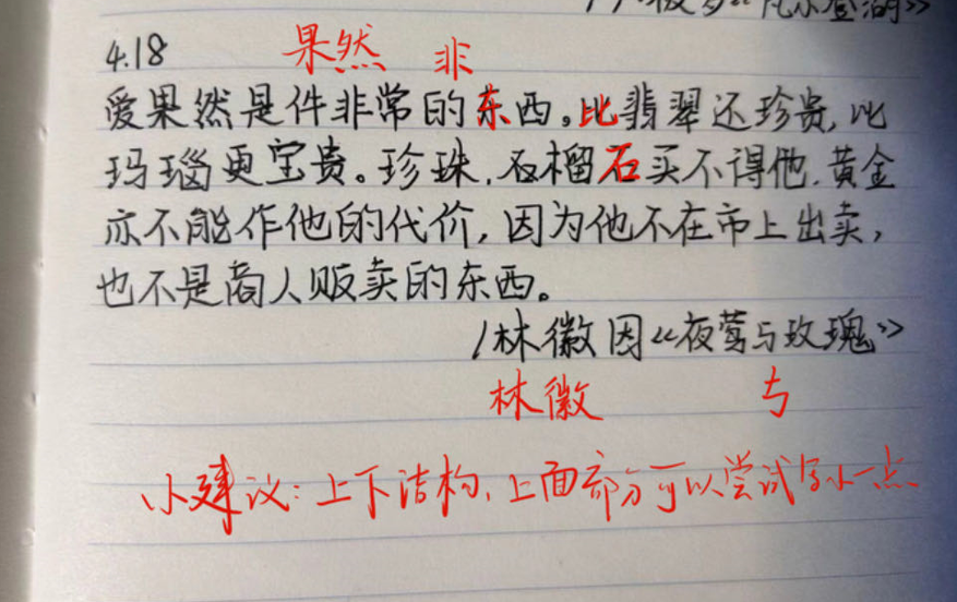 同学们在打卡群内积极参与每日练字打卡,相互观摩学习。导师们在每日作品中进行批注和打分,帮助同学们纠正字体字形,大家的书写能力不断进步。