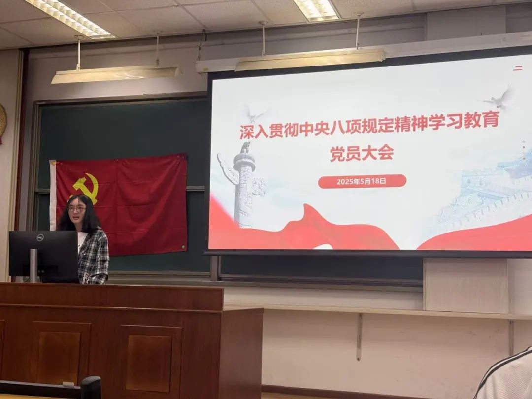 为全面学习贯彻习近平新时代中国特色社会主义思想,深入学习贯彻中央八项规定精神,推进党纪学习教育常态化长效化,2025年5月18日晚,乐育党支部顺利举办中央八项规定精神学习教育党员大会。会议由支部书记周雯睿同志主持。
