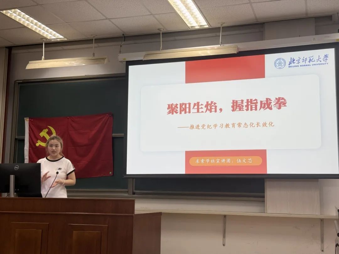 会议邀请求索学社宣讲团的伍文芯同志为支部同志进行主题宣讲的学习教育活动,宣讲的题目为《“聚阳生焰,握指成拳——推进党纪学习教育常态化长效化”》。