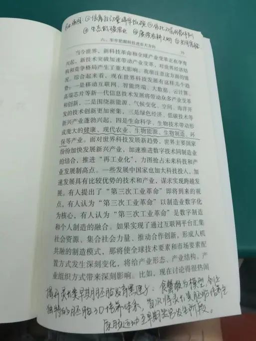各位同志积极讨论并分享自己的阅读感悟。习近平总书记在书中对“科技创新”做出的许多绝妙比喻给大家留下了深刻的印象,同时,针对书中第六章总书记指出的“综合来看,现代世界科技发展有这样几个趋势:…… 四是生命科学、生物技术带动形成庞大的健康、现代农业、生物能源、生物制造、环保等产业。”同志们纷纷分享自己所了解的生物科学领域的科技创新。