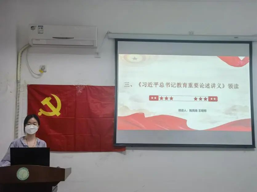 首先,博学党支部第二党小组的鲍周扬同志和王明明同志就《习近平总书记教育重要论述讲义》展开领读。她们概述了习近平总书记教育重要论述的时代背景、九个“坚持”的科学内涵以及重大意义,并就其中的科学内涵展开详细介绍,即从坚持党对教育事业的全面领导、坚持把立德树人作为根本任务、坚持优先发展教育事业、坚持社会主义办学方向、坚持扎根中国大地办教育、坚持以人民为中心发展教育、坚持深化教育改革创新、坚持把服务中华民族伟大复兴作为教育的重要使命、坚持把教师队伍建设作为基础工作九个方面呈现《讲义》中的关键内容。
