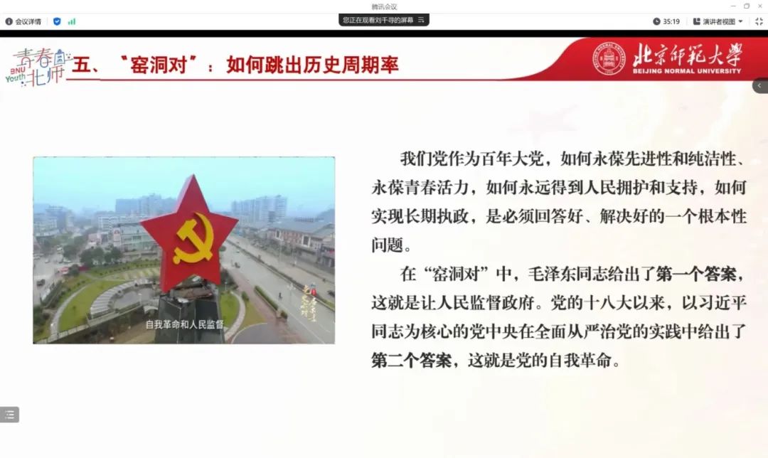 在“窑洞对”中,毛泽东指出只有让人民来监督政府,政府才不敢松懈,要用民主的力量打破历史周期律;党的十八大以来,以习近平同志为核心的党中央在全面从严治党的实践中继续探索跳出历史周期律的第二个答案,这就是党的自我革命。