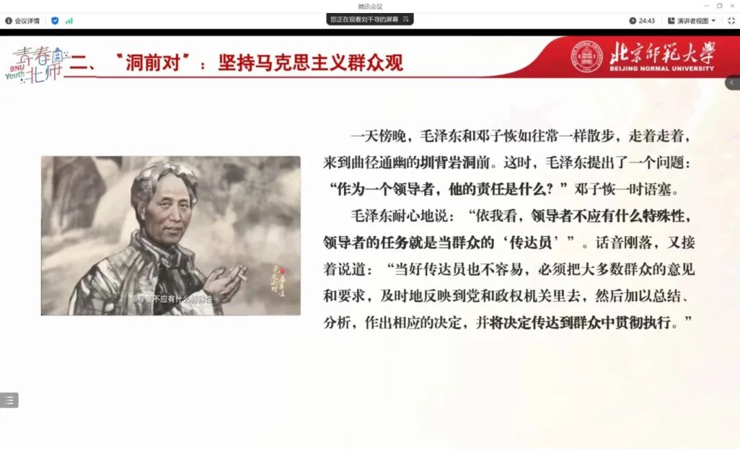 在“洞前对”中,毛泽东对党的领导人的责任做出解答,言简意赅地阐述了我党所坚持的马克思主义群众观和“从群众中来,到群众中去”的群众路线。