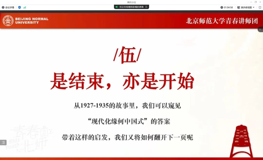 随后,陈歆曈同志以史为鉴,带领我们窥见“现代化缘何中国式”的答案——那就是带着过往的经验与历史教训,以传承为前进的后盾,以思想的再思考为前进的动力,将已经结束的历史作为新时代新征程的新开始。这不仅是对于革命先辈们的真正追随与尊敬,更是我党永葆青春活力的根本力量。