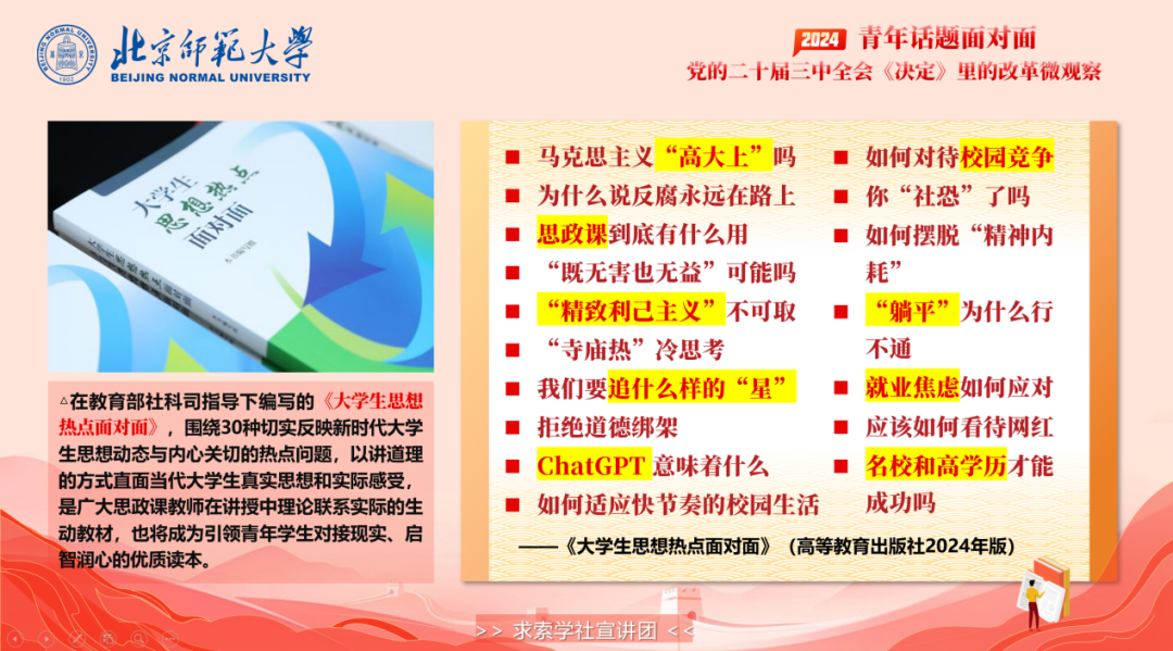 宣讲的过程中,樊奕聪、任紫莹两位同志都进行了好文荐读环节,通过推荐有价值的文件和书籍来帮助大家更好地学习党的二十届三中全会精神。推荐的文件如《中共中央关于进一步全面深化改革、推进中国式现代化的决定》单行本,通过直接阅读《决定》内容,帮助大家直接了解文件精神;推荐书籍如在教育部社科司指导下编写的《大学生思想热点面对面》,本书以讲道理的方式直面当代大学生真实思想和实际感受,是广大思政课教师在讲授中,理论联系实际,共同编写出的生动教材,也将成为引领青年学生对接现实、启智润心的优质读本。