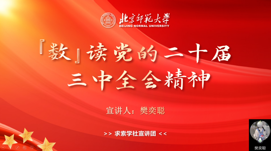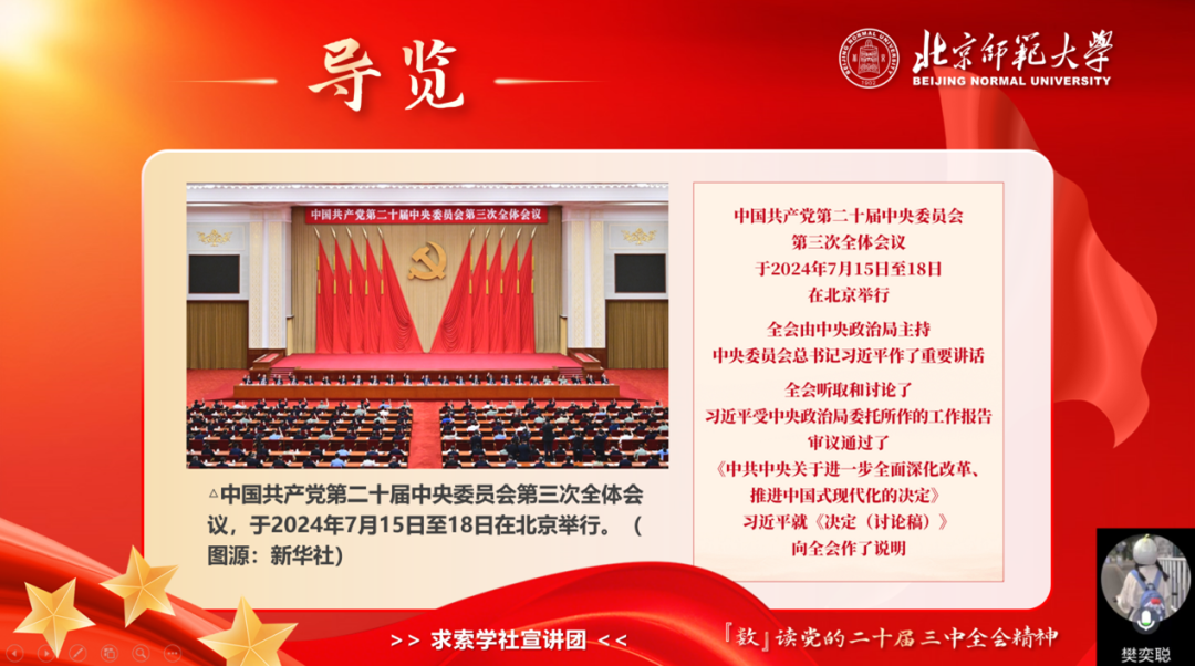 党的二十届三中全会通过的《中共中央关于进一步全面深化改革、推进中国式现代化的决定》提出进一步全面深化改革的指导思想,“习近平总书记关于全面深化改革的一系列新思想、新观点、新论断”是其中最重要的内容。为全面学习贯彻习近平新时代中国特色社会主义思想,深入理解党的二十届三中全会精神,2024年10月26日19:00,致远党支部顺利开展“学习党的二十届三中全会精神”专题宣讲活动。本次宣讲特别邀请到马克思主义学院求索学社宣讲团的樊奕聪、任紫莹两位同志作为主讲人,从不同角度出发为大家详细解读党的二十届三中全会精神。