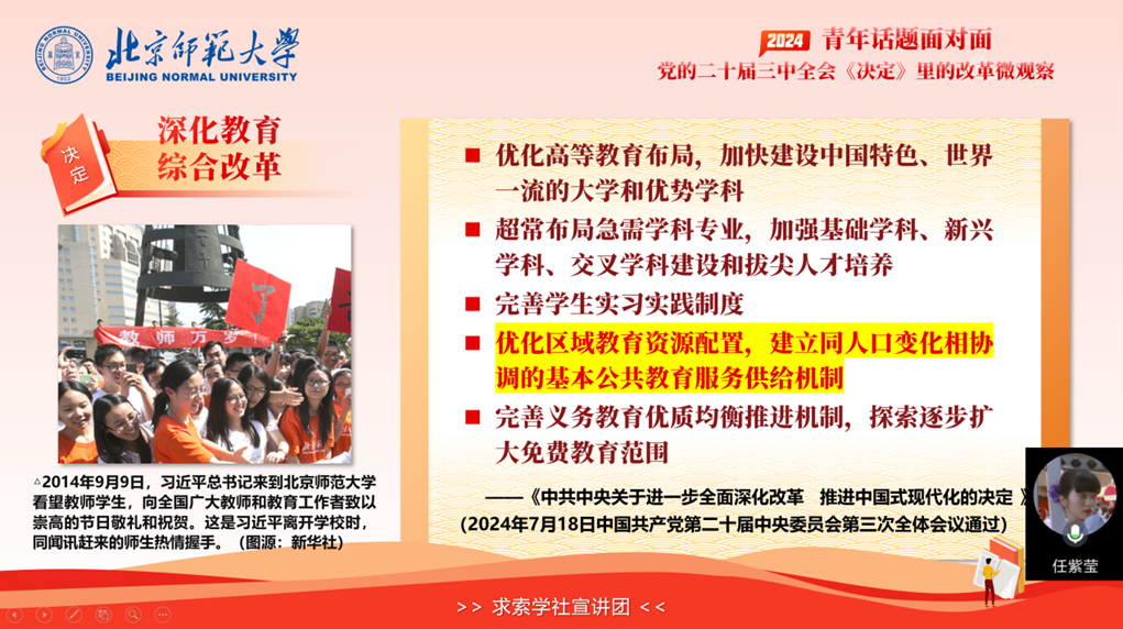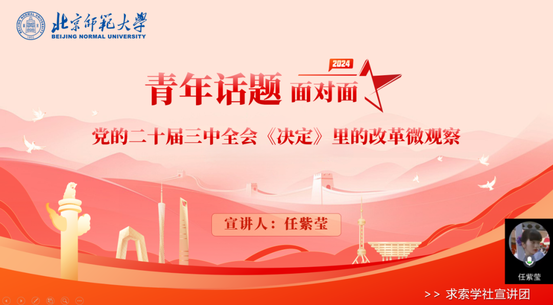 任紫莹同志以《青年话题面对面:党的二十届三中全会〈决定〉里的改革微观察》为主题,探讨了当代青年在进一步全面深化改革的大背景下应当承担的责任和义务,也指出了属于我们这代青年人的时代机遇。
