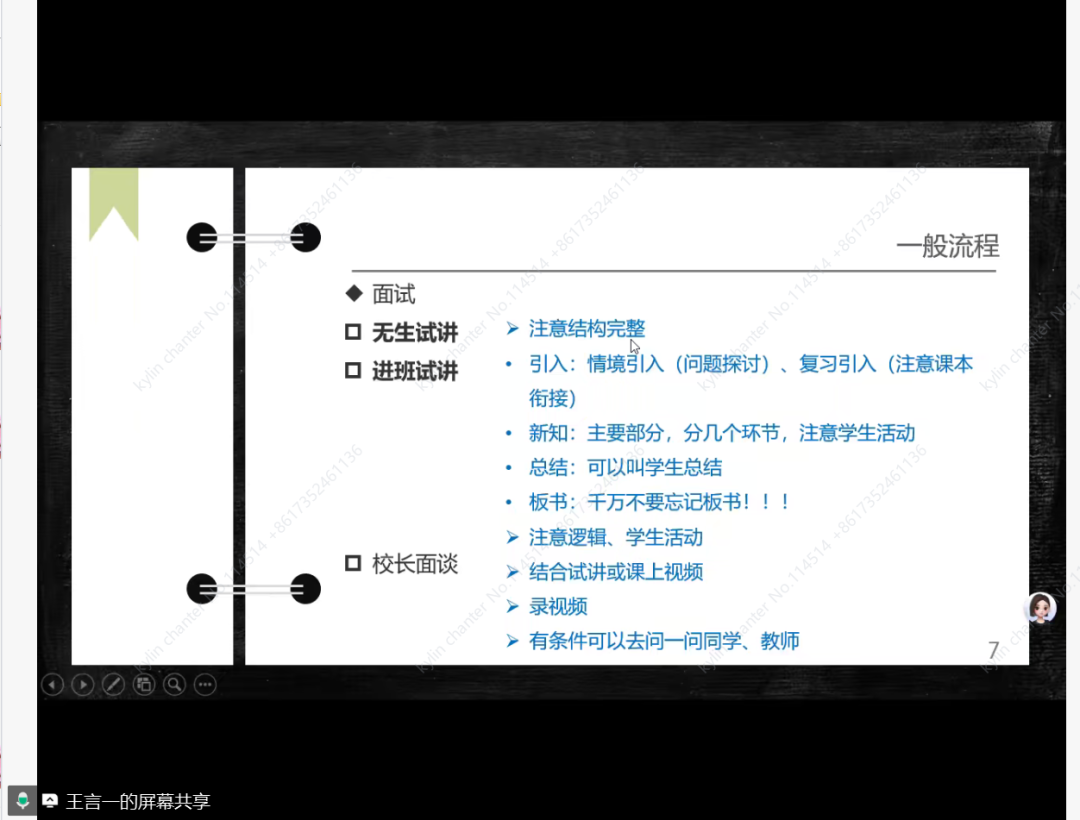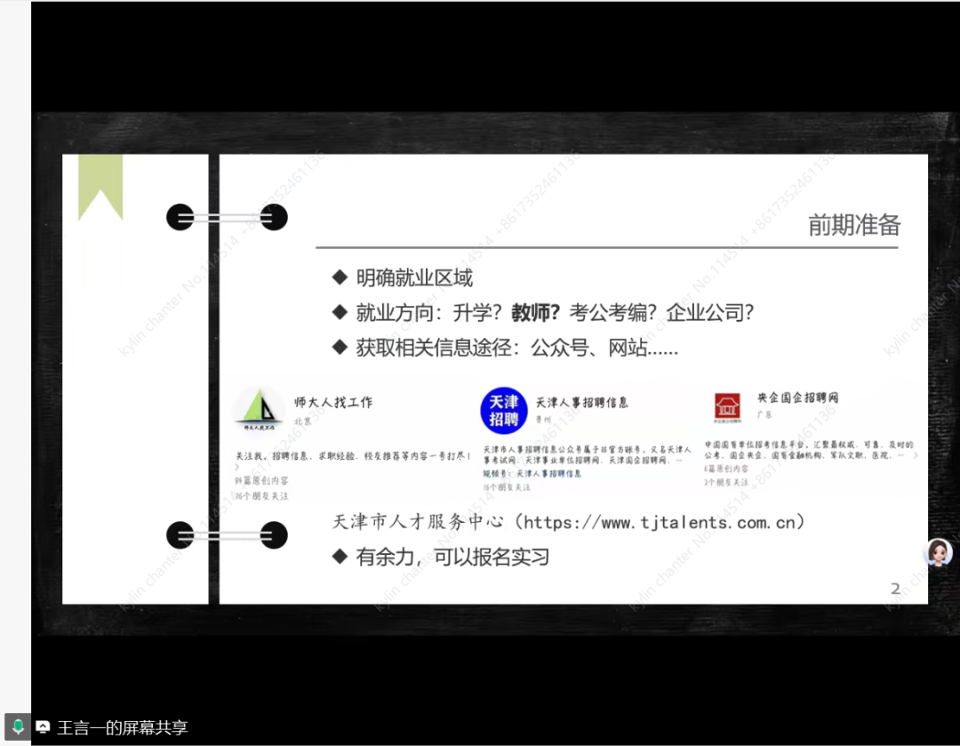 接下来,王言一同志详细介绍了求职流程,包括参加招聘会、投递简历、笔试、面试及材料核验等环节。关于笔试准备,她建议注重高中生物课本复习、高考题或教招原题练习及教育心理学理论学习。她深入剖析面试中的结构化面试、说课及试讲要点,推荐提前准备教育理论、熟悉课程标准,确保说课涵盖教材分析、教学目标等要素,并通过观看公开课或录制试讲视频优化表达。她还分享了校长面谈的技巧,建议同学们展现自己的职业规划和对学校的了解。