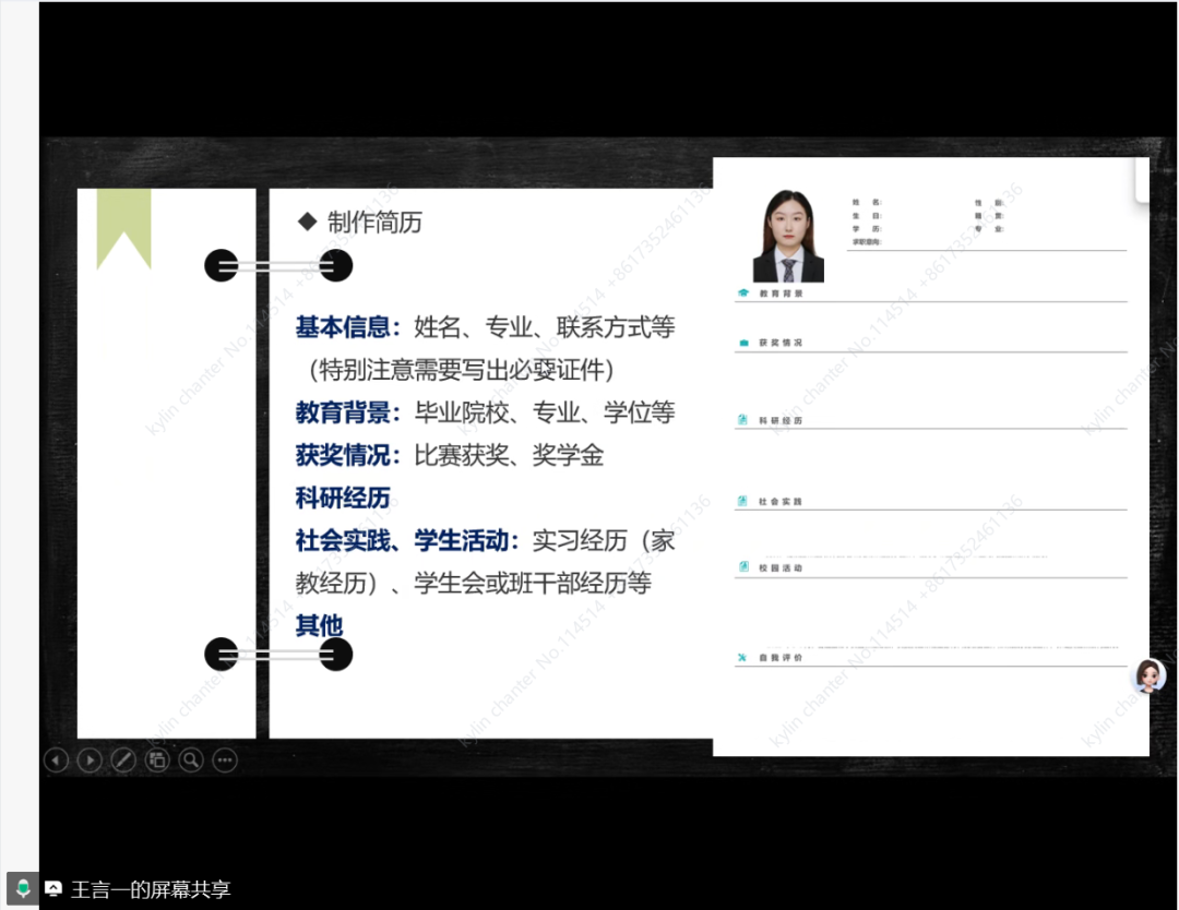 随后,王言一同志强调了简历制作在求职过程中的关键作用,建议同学们精心设计简历,将亮点放在显眼位置,简历应涵盖基本信息、教育背景、实习经历及社会实践等内容,以全面展示个人能力。她还推荐根据简历内容提前准备自我介绍,确保在面试中能够清晰、自信地表达自身优势。