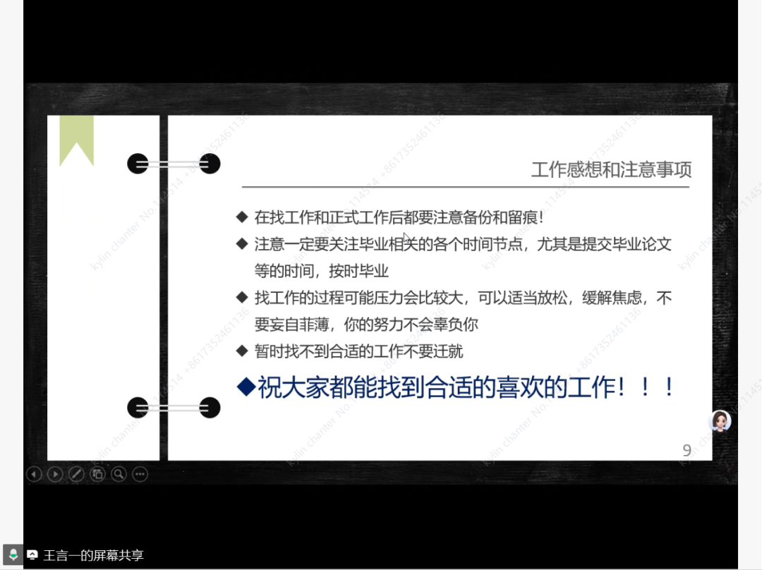 最后,王言一同志分享了作为高中生物教师的工作感悟。她提醒同学们在求职和工作中注意材料备份与留痕,关注毕业论文提交等关键时间节点,确保顺利毕业。她鼓励大家保持积极心态,适当缓解求职压力,找到适合自己的职业道路,同时注重身体健康与教学能力的持续提升。