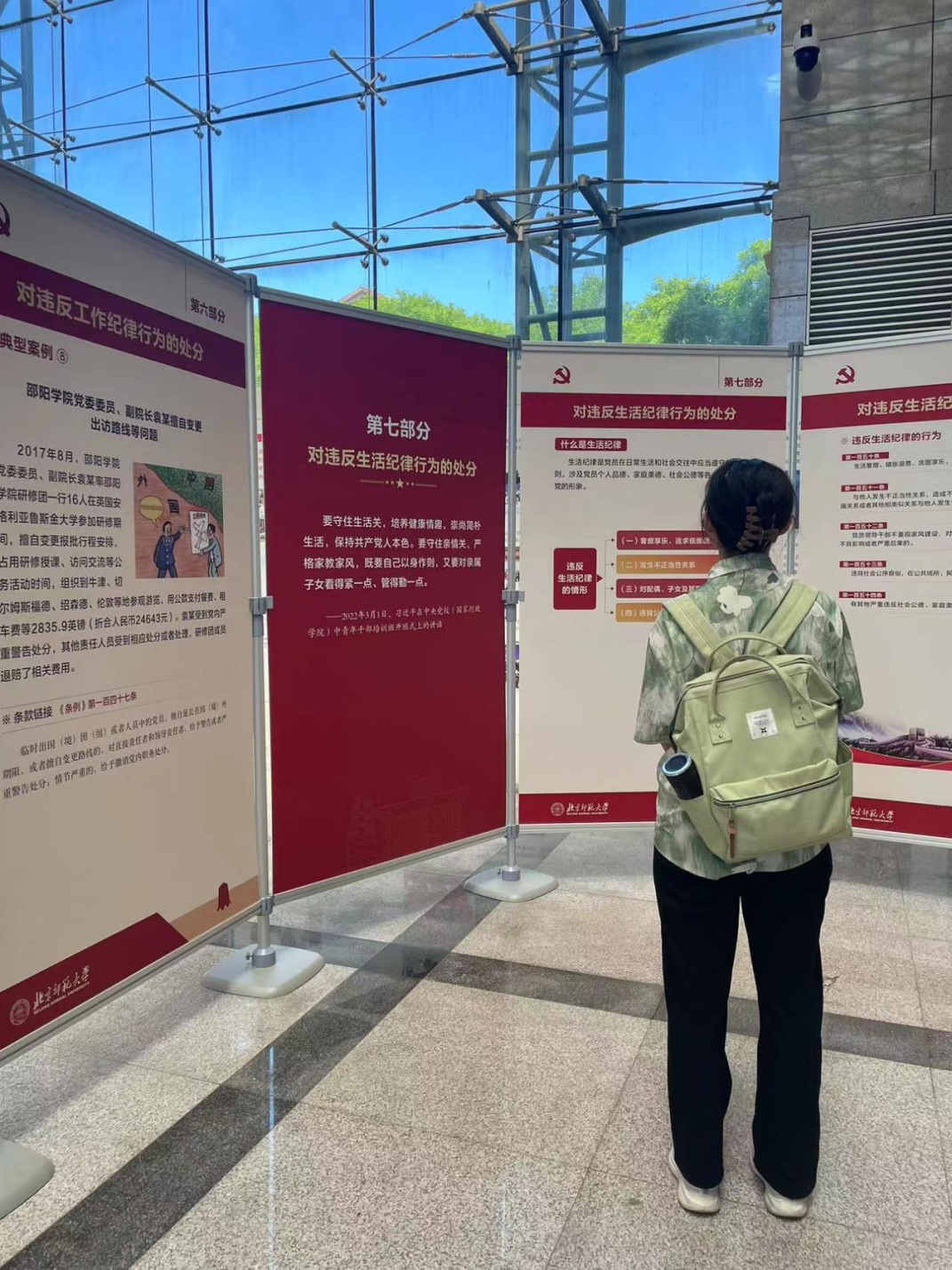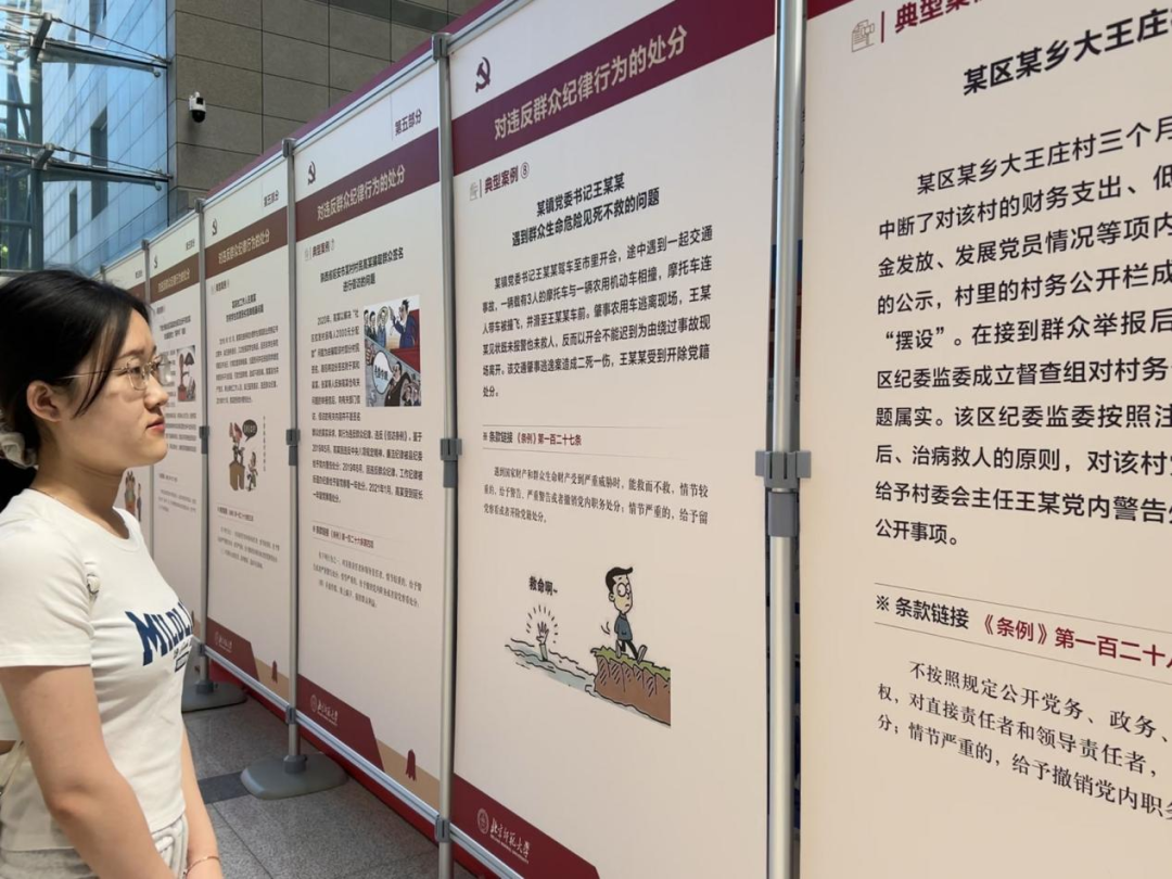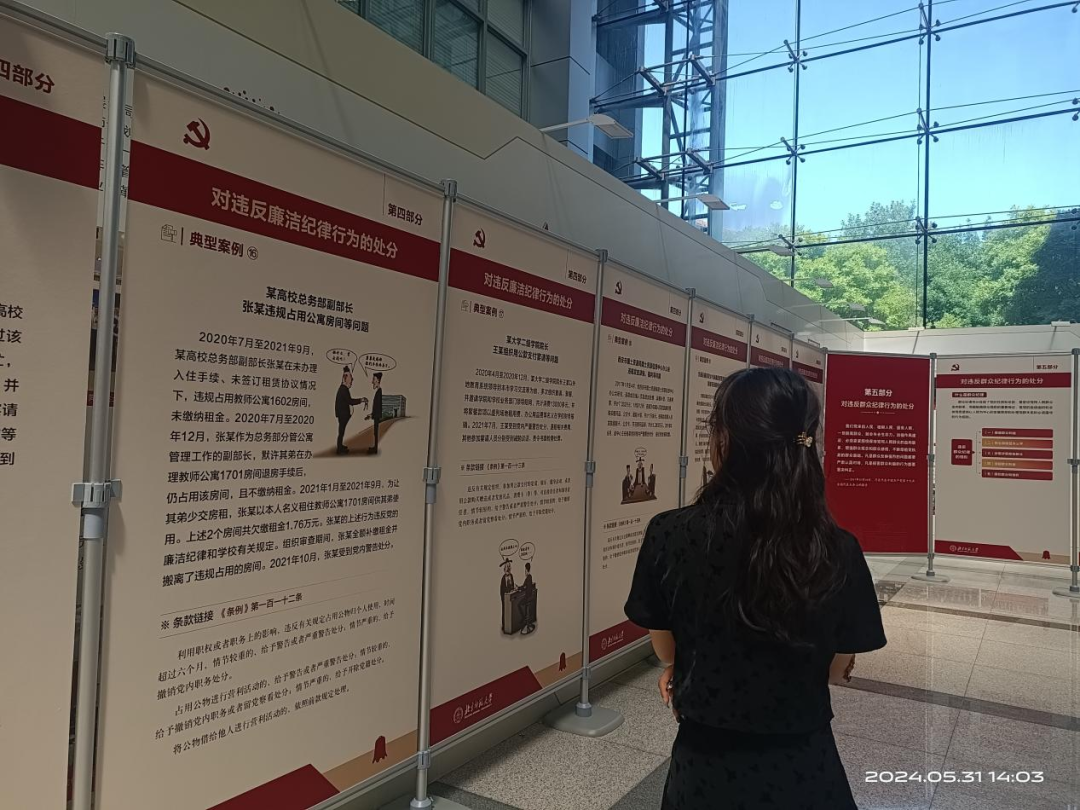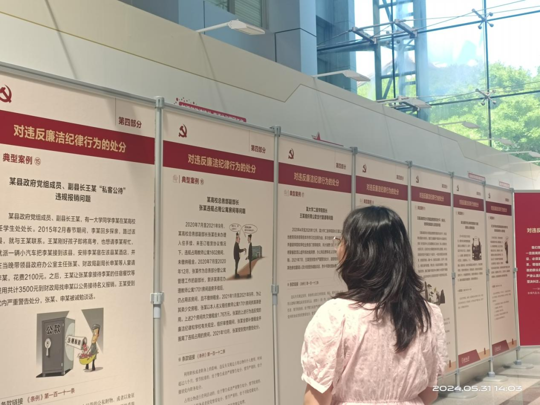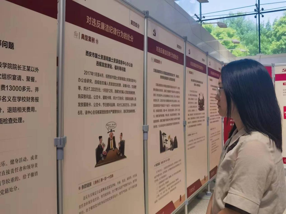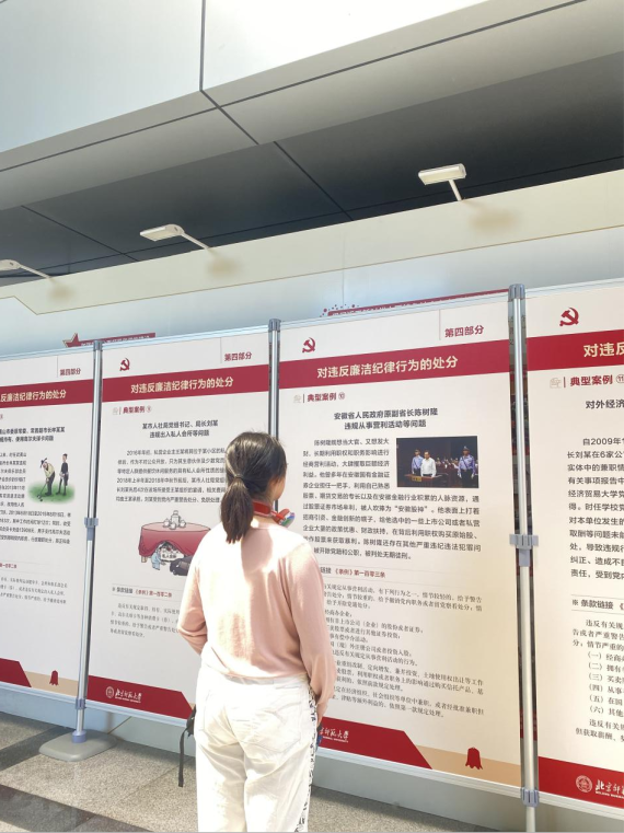 纪律严明是党的光荣传统和独特优势。党的十八大以来,以习近平同志为核心的党中央把纪律建设摆设在更加突出的位置,坚持严的基调,不断完善纪律规矩,充分彰显了党推进自我革命的坚定决心和坚强意志。本次展览包括习近平总书记关于党纪学习教育的重要讲话、《条例》修订及其意义、《条例》内容以及典型案例等。同学们通过本次展览,加深了对《条例》的掌握和理解,了解了典型案例,不断加强自身,努力践行“学纪、知纪、明纪、守纪”。