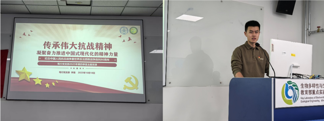 为深入学习贯彻习近平总书记关于传承伟大抗战精神的重要论述,落实《中共北京师范大学生命科学学院委员会关于纪念中国人民抗日战争暨世界反法西斯战争胜利80周年工作方案》中“一次以抗战历史、抗战精神为主题的集中研讨”的活动要求,2025年10月18日,笃行党支部举办“弘扬伟大抗战精神”支书讲党课暨专题研讨会。党支部书记李强主讲党课,全体党员参加学习研讨,在回望历史中汲取精神滋养,在思想碰撞中凝聚奋进力量。