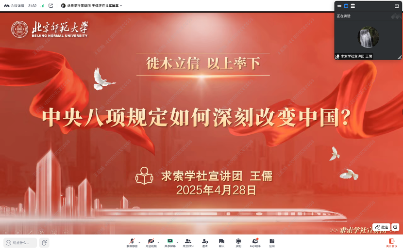 北京师范大学马克思主义学院求索学社宣讲团成员王儒受邀来到支部,带来一场题为《徙木立信,以上率下——中央八项规定如何深刻改变中国?》的专题宣讲。