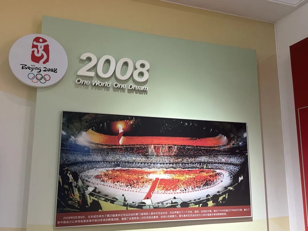 展厅内,2008年北京奥运会开幕式的照片吸引了大家的注意。这是中国首次举办的夏季奥林匹克运动会,向世界展现改革开放后中国的综合国力与文化魅力,具有里程碑意义。开幕式以“和”为核心理念,融合传统与现代元素,重塑国际社会对中国的认知。奥运会的成功举办还推动了国家基础设施建设与城市治理升级,通过48枚金牌的突破和全民参与的热潮,激发社会体育意识,加速体育强国建设。奥运会亦成为中外文明对话的桥梁,为全球化背景下的中国形象塑造提供典范,标志着中国以更开放姿态融入世界体系。