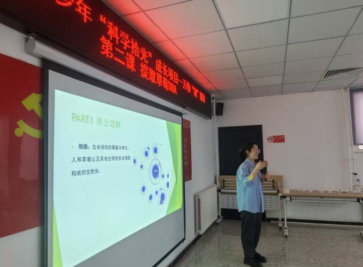 活动伊始,主讲人朱晓菲以生动易懂的语言讲解了DNA的结构与功能,并结合动画视频演示提取原理。孩子们专注倾听,不时发出惊叹。