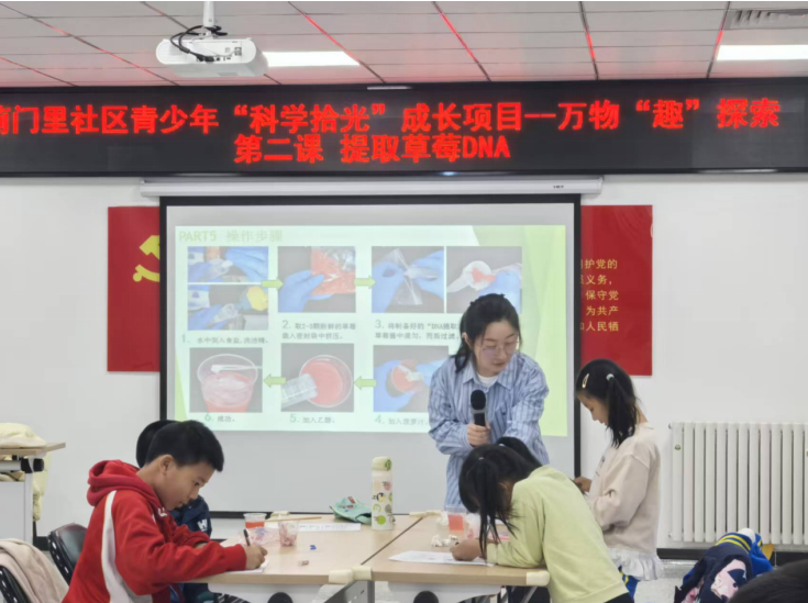 2025年3月28日,生命科学学院乐育党支部应蓟门里社区邀请,面向社区儿童开展“科学拾光”成长项目系列课程之《提取草莓的DNA》。本次科普微课以沉浸式实验教学为主,吸引了20余名小学生参与。