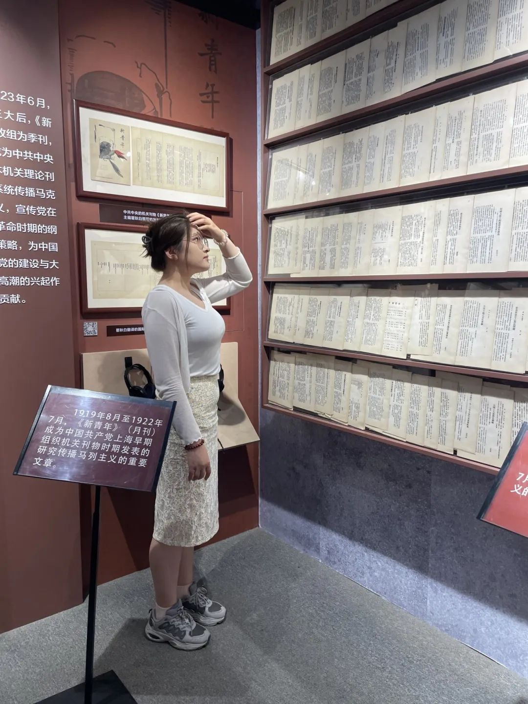 近几年,《觉醒年代》的热播无疑让《新青年》和它成刊背后的故事被大众所知晓。《新青年》由陈独秀创刊于五四运动时期,并在当时作为一本弘扬革命新思想的重要刊物,倡导“德先生”(民主)与“赛先生”(科学),对这一时期甚至后世都造成深远的影响。《新青年)在新文化运动中,倡导民主与科学,反对专制统治和迷信盲从,使人们从封建思想的束缚中解放出来;揭露和抨击人吃人的封建礼数,主张“独立人格”和“平等人权”的新道德;提出“文学革命”的口号,提倡白话文,显示了新文学的生命力。有多篇重要作品在此刊发表,如我们耳熟能详的陈独秀的《敬告青年》,鲁迅的《狂人日记》《孔乙己》等等。看着编辑部旧址展柜里的书页,我不禁震撼于先驱们的清醒与勇敢。