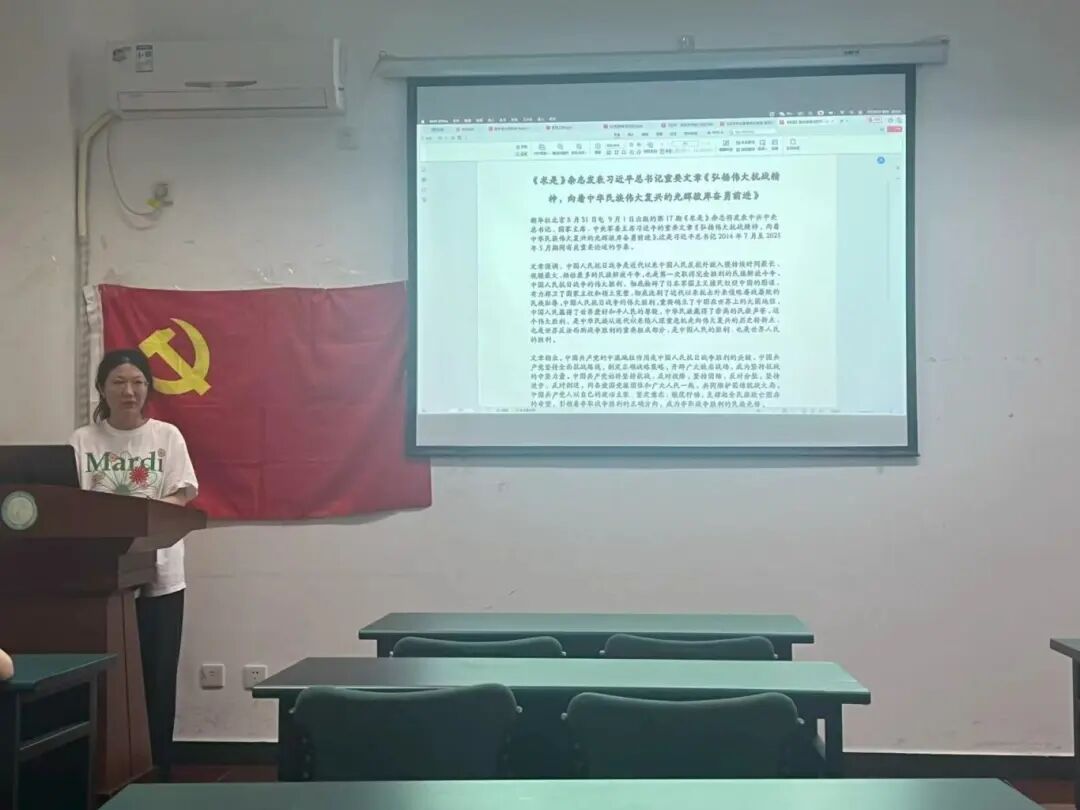 第一党小组围绕抗战主题开展深入研讨。秦越同志带领学习了《陕甘宁边区政府、第八路军后方留守处布告》,从历史背景、核心内容、政治智慧等方面进行了系统分析;杨洋同志结合阅兵仪式,特别是维和部队方阵,阐述了大国担当;李青宸同志带领大家重温伟大抗战精神的四个方面,从历史、未来、个人三个维度回答了“我们在纪念什么”这一深刻命题。