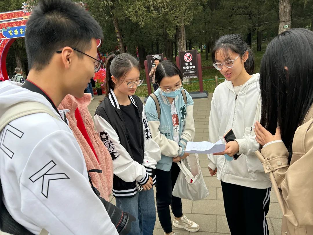 4月14日上午10:00,参与团建活动的同学在景山公园西门集合。主持人文校茹同志负责签到、讲解游戏规则并组织分组。