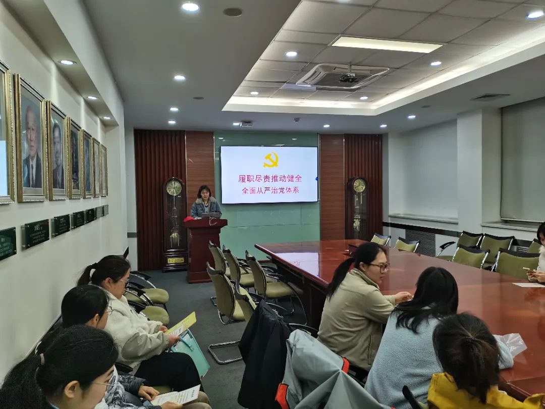 会议伊始,党支部书记王天娇以《履职尽责推动健全全面从严治党体系》为题讲授专题党课。从“为什么要全面从严治党”和“全面从严治党的成就和启示”两方面为我们展开了讲解。党支部书记带领支部成员回顾了全面从严治党的历史背景,明确了全面从严治党的重要意义。党课从当前任务出发,同时结合了支部实际,深入剖析了学生党员在新时代背景下的责任与担当,进一步增强了支部成员的政治意识和责任意识。