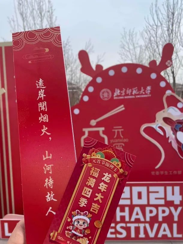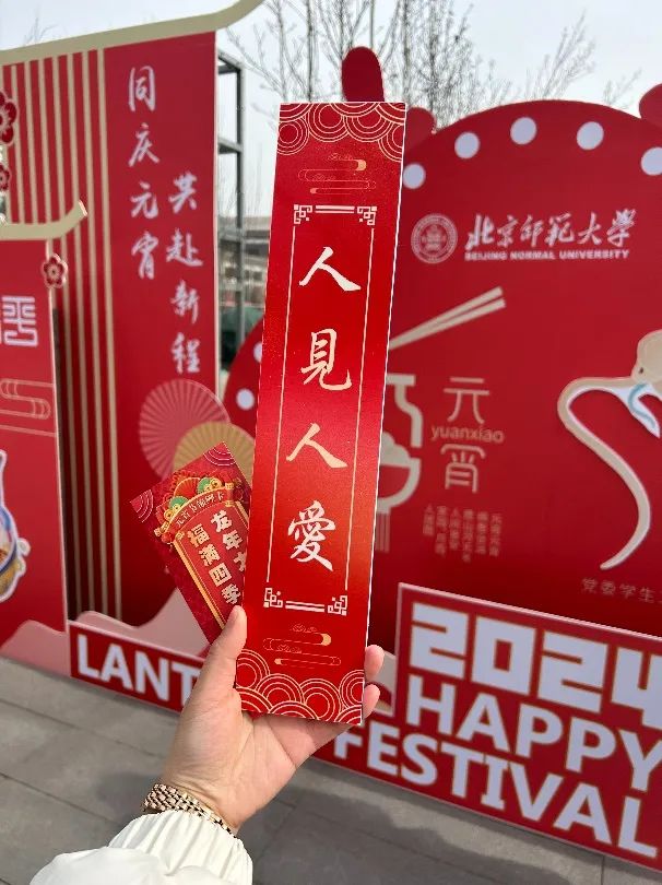 在北师大昌平校园体验了学校组织的元宵节活动。在其中猜灯谜的活动过程中,一张张妙趣横生的灯谜紧扣节日,内容丰富有趣,风趣贴切,吸引大家纷纷驻足参与活动。整个场面热闹、温馨、其乐融融,让我感受到了浓浓的节日氛围。