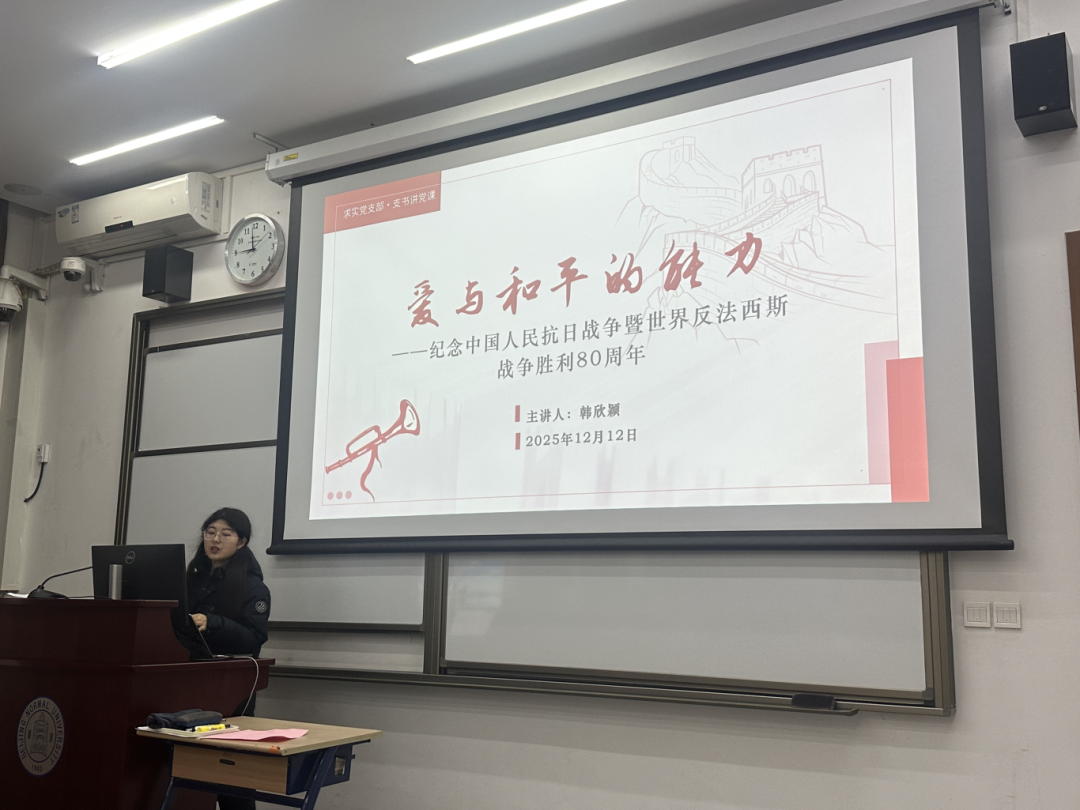 为进一步加强党支部组织建设,明确未来发展方向,传承和弘扬伟大的抗战精神,生命科学学院求实党支部于2025年12月12日19:00,在生二教室召开了换届后的首次全员大会,并由党支部书记主讲专题党课。