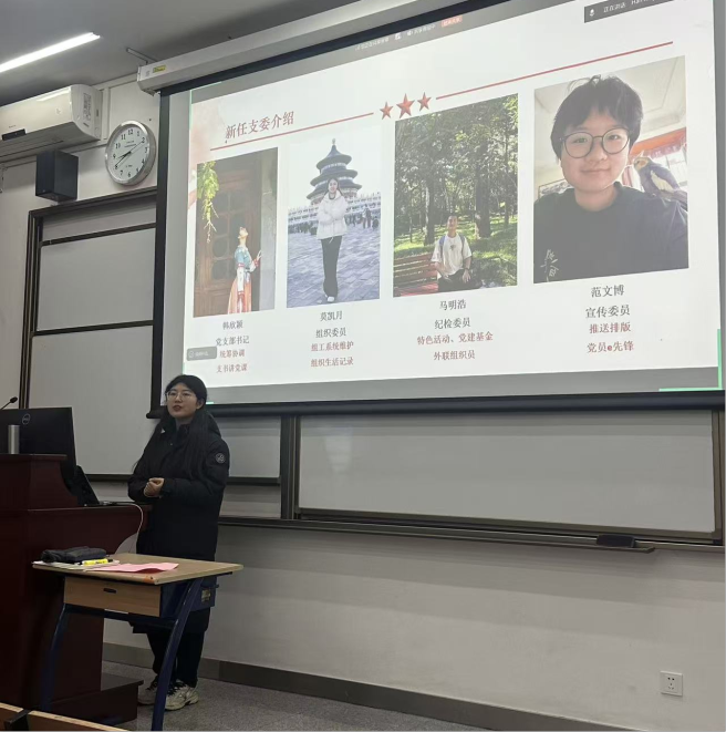 会议第二项,介绍换届后的新支委成员及各党小组组长。党支部书记韩欣颖以《汉书·河间献王刘德传》中“修学好古,实事求是”为引,深刻阐释了支部“实事求是、知行合一”的发展理念与核心精神。随后,会议进入新支委成员及党小组组长自我介绍环节,新当选的支部委员与各党小组组长逐一亮相,分享了自己对党支部工作的理解与未来的工作设想,展现了良好精神风貌与服务热情。