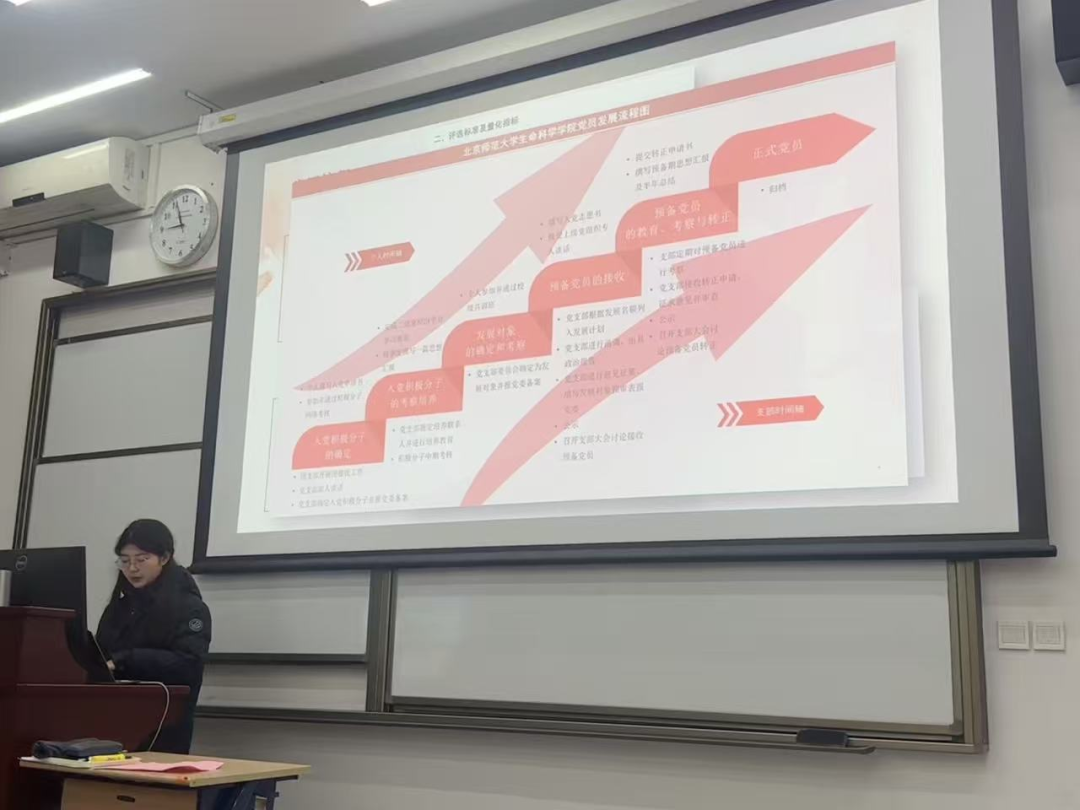 会议第三项,支部标准化规范化建设情况介绍以及工作部署。在明确了组织架构后,韩欣颖书记为全体党员、发展对象和入党积极分子详细讲解了党支部的日常运转流程,系统介绍了从申请入党到成为正式党员的各个环节、发展标准与时间节点,并对生命科学学院二级党校的课程设置、学分要求以及日常会议、理论学习、主题实践等活动的组织形式进行了说明。此外,她还对支部秋季学期的重点工作安排进行了部署,使在场的每一位成员对党支部的工作有了更清晰、更全面的认识,为未来的学习和工作指明了方向。