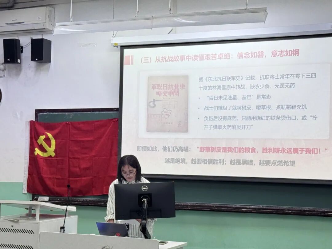周雯睿同志从四个方面深入阐述了伟大抗战精神的深刻内涵。她首先从抗战故事中讲述“家国情怀”,强调无数中华儿女在民族危亡时以舍身为国的担当诠释忠诚与奉献;随后讲到“民族气节”,通过杨靖宇、赵一曼、狼牙山五壮士等英雄事迹,展现了中华民族“富贵不能淫、威武不能屈”的精神脊梁;第三部分聚焦“艰苦卓绝”,讲述抗联将士、八路军、新四军在极端困境中自力更生、浴血奋战的感人场景,指出这种精神是中国共产党人永恒的精神底色;最后,她以“团结伟力”为主题,回顾抗日民族统一战线形成的历史经验,强调团结奋斗是中华民族战胜一切艰难险阻的不竭动力。
