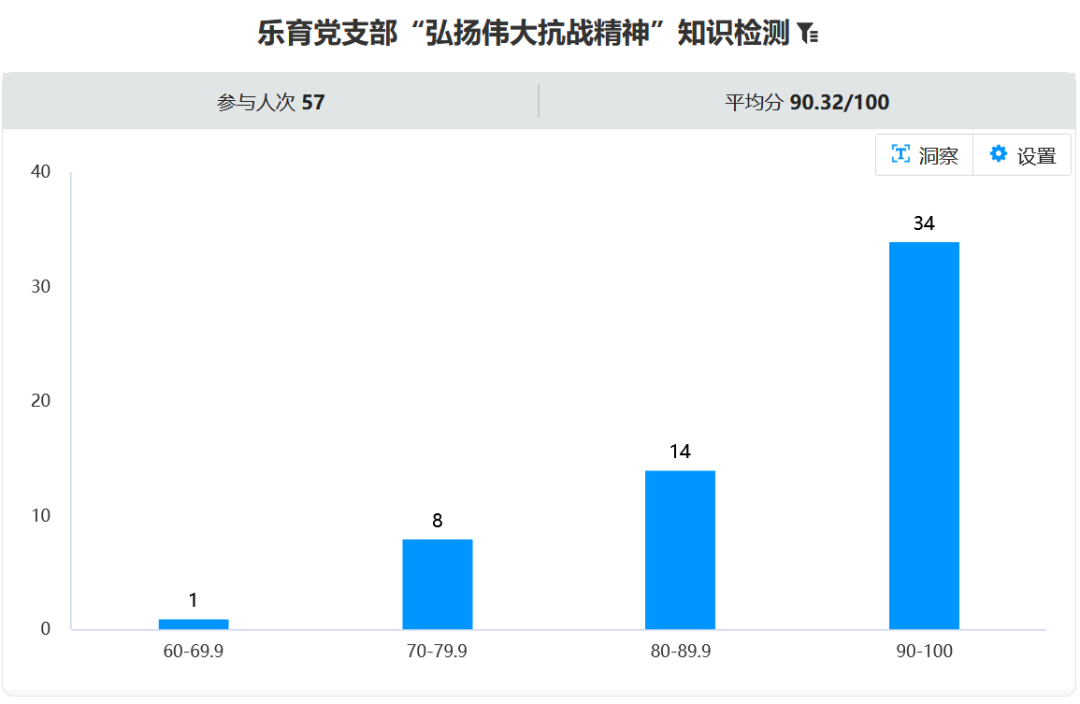 本次知识检测以抗日战争和世界反法西斯战争的重要历史节点、关键人物及精神内涵为核心内容,共设15道单选与多选题。参会的57名同志参与答题,平均分为90.32,整体答题正确率高、表现优异,充分体现了支部成员对抗战历史的扎实掌握。