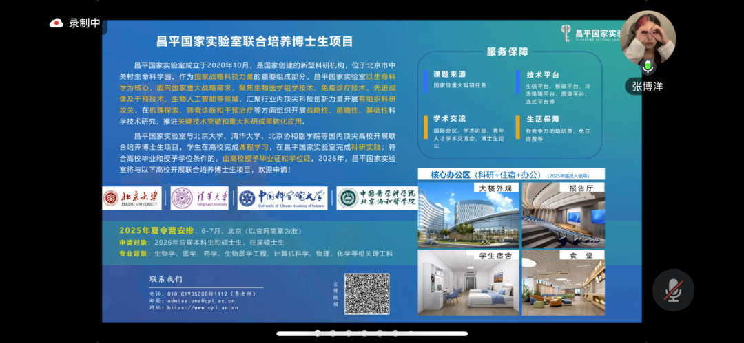 第三位是推免至北京大学前沿交叉学院整合生命科学专业攻读博士学位的张博洋同志。她为我们介绍了自己到昌平国家实验室参加夏令营的具体流程,包括材料的准备、个人陈述以及面试的经历经验,鼓励大家积极探索自身兴趣,主动向相关导师联系和提问。