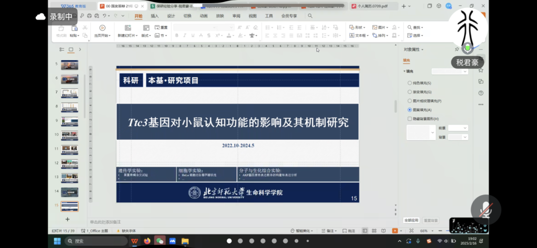 第一位是推免至北京大学生命科学学院生物学方向攻读博士学位的税君豪同志。他从自身经验出发,分享自己参加夏令营的具体流程以及面试的相关经历,鼓励大家重视本科生阶段的科研经历,在专业基础上,积极探索自己的兴趣和方向,在面试中尽量以真诚的态度去回答问题。