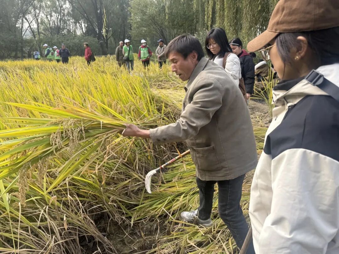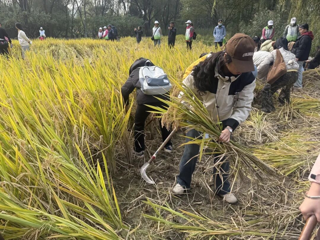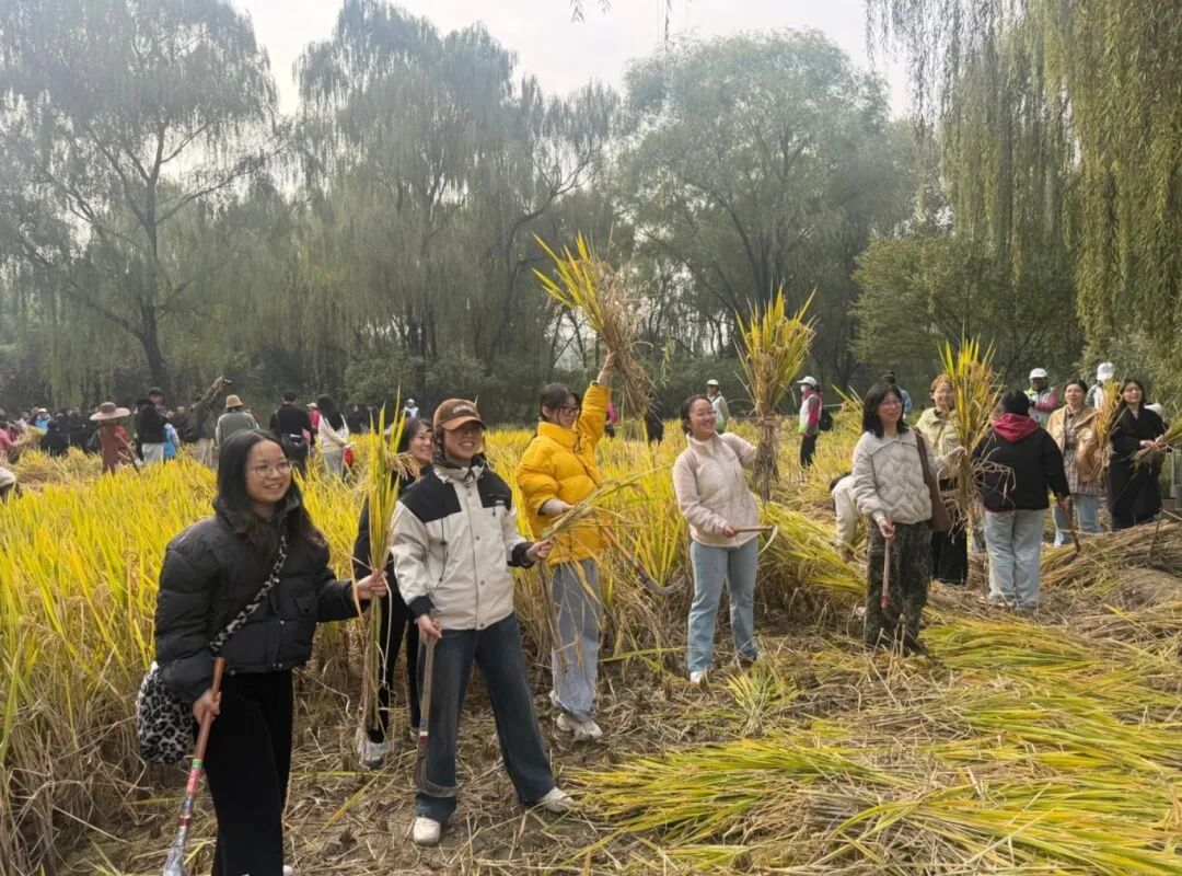 今天我参与了海淀公园收割节活动。正值十月,田间的稻谷变得金黄饱满,等待收割。这个活动吸引了很多大人小孩的参与,田间都是大家忙碌的身影。活动的工作人员给我们每人分发镰刀,还有几位老农手把手教大家使用镰刀。一开始,我割的并不太流畅,但是在听完老农们的讲解后我抓紧掌握了割稻谷的诀窍。当一簇簇饱满的稻穗随着“咔嚓”声倒下时,心中突然涌起一股莫名的踏实,那些曾在书本里看到的“粒粒皆辛苦”,在此刻具象化。本次收割节让我们远离城市的喧嚣,触摸土地的温度,更对“一粥一饭,当思来处不易”有了更深的体会。