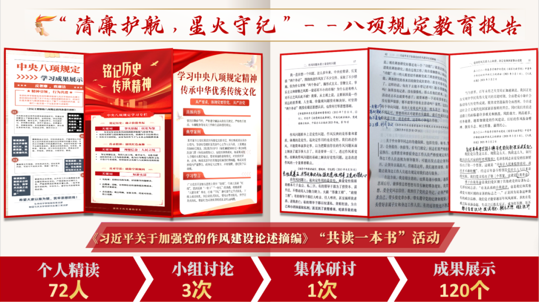 共建支部以“学纪、知纪、明纪、守纪”为目标,构建“理论铸魂—实践淬炼”双轮驱动体系,推动纪律教育走深走实。在理论层面,打造“精读深研+情景演绎+多维联动”三维教育矩阵,通过共读《论述摘编》、开展“明规矩·守底线”情景课堂、组织观影研讨与党课学习,强化纪律认知与底线意识;在实践层面,组织赴受水河廉洁教育基地开展沉浸式学习,参观八项规定专题展,促进纪律意识从思想自觉转化为行为自觉,切实筑牢支部清廉根基。