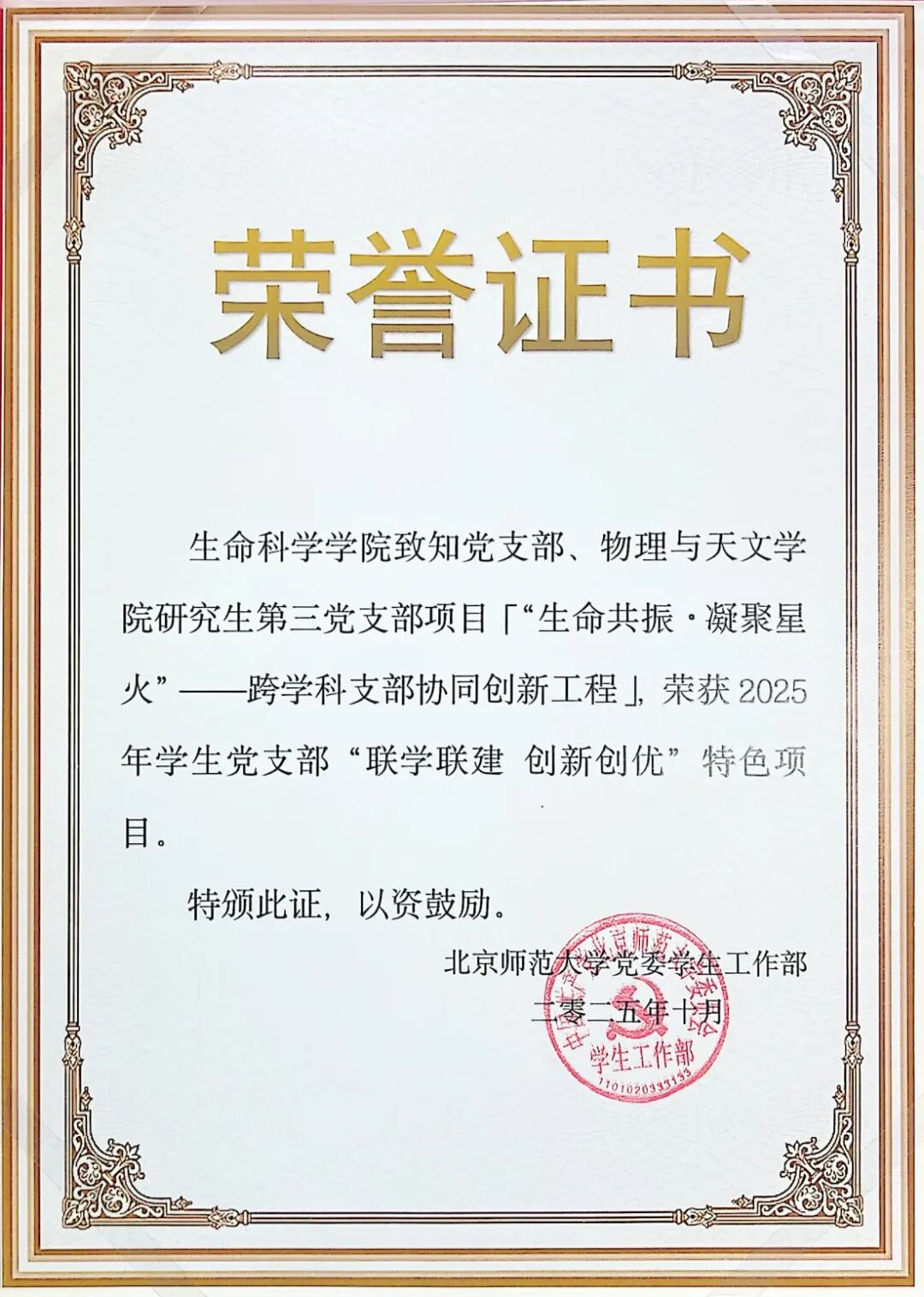 在北京师范大学2025年学生党支部“联学联建 创新创优”项目评选中,生命科学学院致知党支部与物理与天文学院研究生第三党支部共建项目“生命共振·凝聚星火”——跨学科支部协同创新工程获评特色项目。