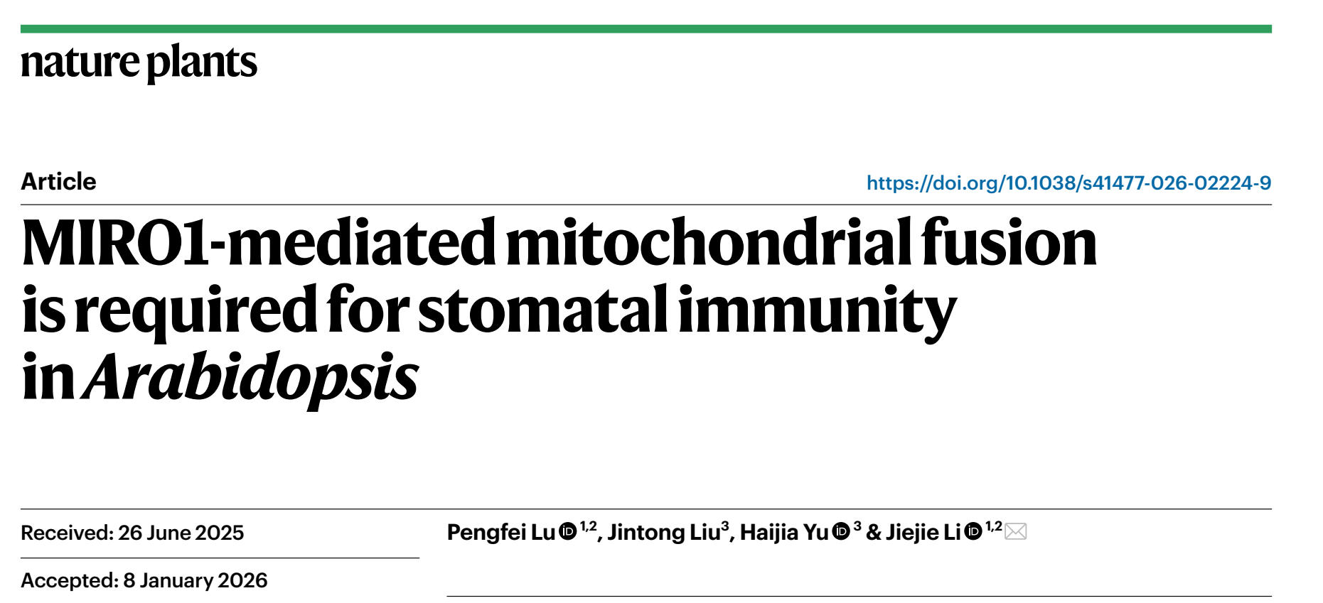 2月5日,生命科学学院李杰婕团队在Nature Plants在线发表了题为“MIRO1-mediated mitochondrial fusion is required for stomatal immunity in Arabidopsis”的研究论文,该研究鉴定到一个定位于线粒体外膜的GTP酶MIRO1,证实其是植物中首个直接介导线粒体膜融合的关键蛋白,并深度解析其协调免疫信号与线粒体功能从而促进气孔免疫的分子调控机制。