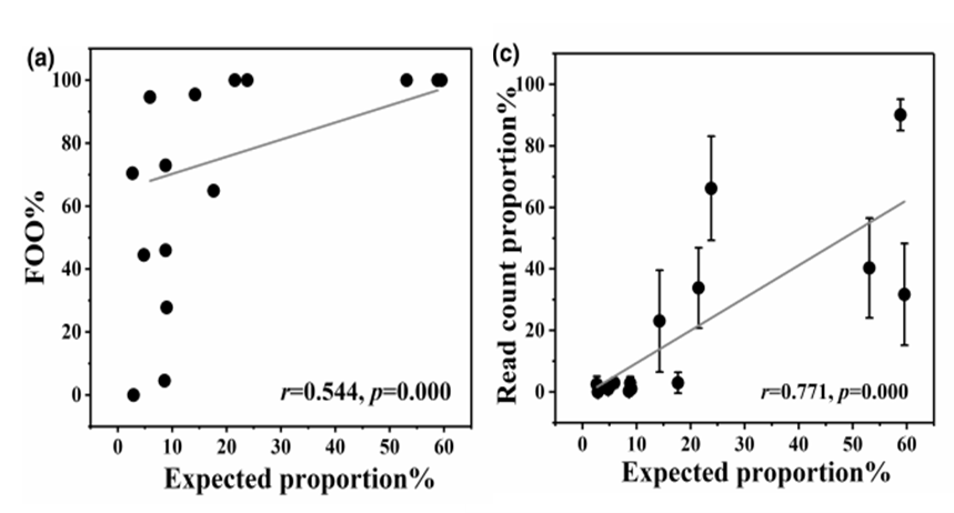 图1 a,c分别代表在粪便样品中的进食预期比例与发生频率(FOO)、序列数之间的相关性;