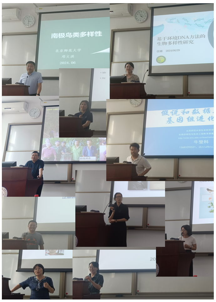 (左上:副院长廖万金致开幕词;右上:生态系系主任邓文洪介绍我院生态学学科情况;左中:生物系系主任张俊杰介绍我院生物学学科情况;右中:副院长席超介绍我院科研平台;下:营员参会现场)