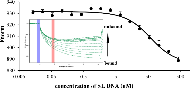 微量热泳动技术(MST)和等温滴定量热法(ITC)是常用的测定大分子相互作用的实验方法,但在实际测定中野生型ALP是不能使用的,因为酶促反应会干扰亲和力的测定。我们表达纯化了带有his-tag的S102L ALP,该突变体保留了酶与底物的亲和力,但由于没有102位丝氨酸的亲核基团,丧失了其对底物的催化活力。我们使用RED-Tris-NTA染料 标记S102L ALP,利用MST测定了其与两种双链DNA(double strand DNA,dsDNA)的亲和力;还利用ITC和GST pull-down技术测定了S102L ALP与磷蛋白β-casein的相互作用。