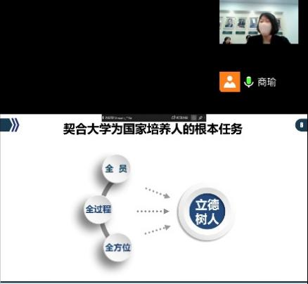 会议伊始,商瑜老师围绕加强课程思政建设,以“思政导航,铸魂育人”为题,对课程思政的内涵和意义进行了深入剖析,推动教师课程育人能力的提升。习近平总书记在清华大学考察时强调,教师要成为大先生,做学生为学、为事、为人的示范,促进学生成长为全面发展的人。根据习总书记关于课程思政的重要论述,商瑜老师强调要把推进课程思政建设作为落实立德树人根本任务的重要抓手,课程思政的本质是一种教育,我们要从教学理念、教师身份、教学思想等方面进行转变,从传授知识过渡到人才培养,从知识的传播者变成价值观的引导者,培养德智体美劳全面发展的社会主义建设者和接班人。
