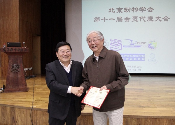 北京动物学会名誉理事长、许崇任教授给张正旺理事长颁发证书