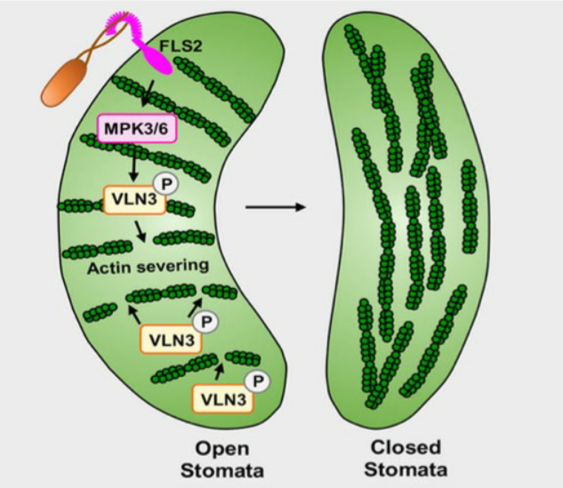 图1. VLN3磷酸化介导的微丝动态调控植物气孔免疫模式图