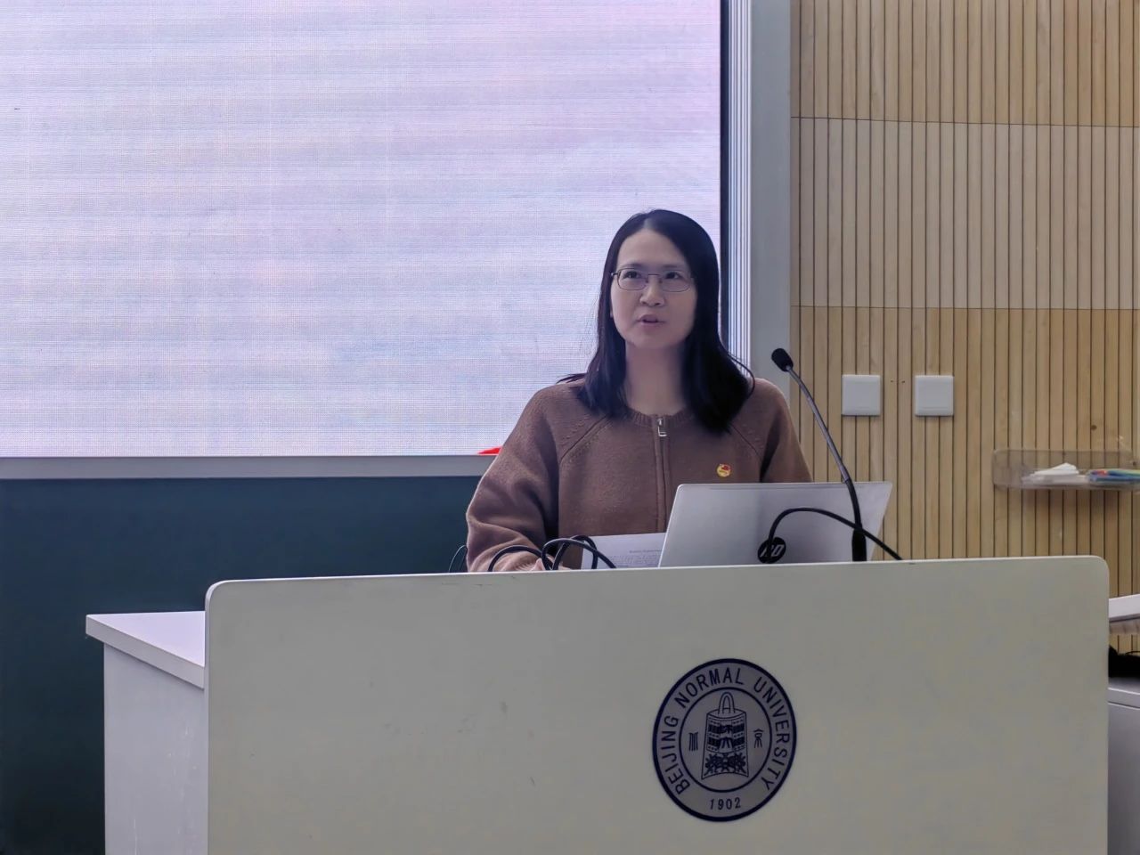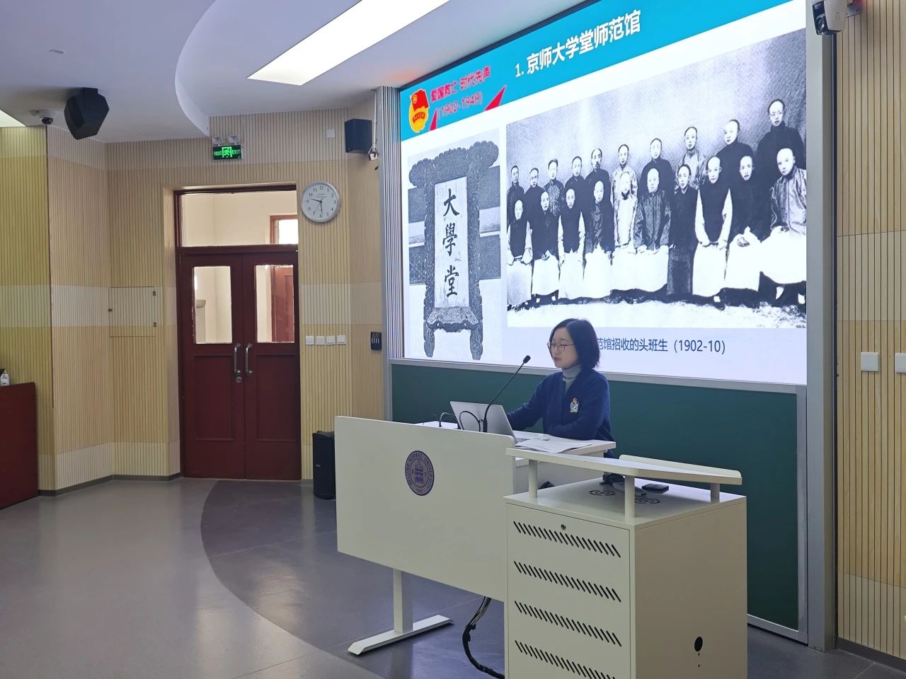 学员团委书记唐如春老师带来了一场精彩的团课,主题为“高举团旗跟党走,青春铸就中国梦——北京师范大学青年运动史”。她带领同学们穿越时空,一同见证北师大的青年们在不同历史时期的奋斗历程。1902-1949年期间,师大青年成立抗俄铁血会、北师大学生会、中华民族解放先锋队等爱国组织,英勇投身五四运动、三一八惨案、一二九运动,发出振聋发聩的爱国救亡时代先声。1929-1978年期间,师大青年胸怀祖国投身建设,支持抗美援朝与土地革命,到祖国最需要的地方去 。1978-2002年期间师大青年乘改革春风勇立潮头,加强新时期革命传统教育,倡导尊师重教的社会新风。时至今日,木铎金声跨越百年,师大学子在无数重大历史事件中展现青年担当,学习践行“四有”好老师讲话精神,形成积极向上、影响力强的校园文化格局,迈入砥砺奋进的崭新时代。最后,唐老师期待同学们能铭记历史,继承红色基因,不忘初心、砥砺前行,为中国梦和师大梦贡献青春力量。