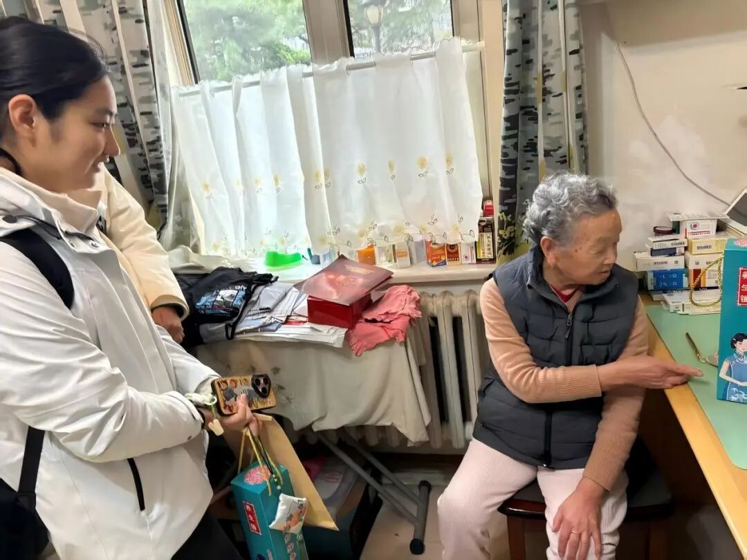 2、冯丹宁:我和带队的老师刚刚走到楼梯拐角处,就听到老人热情的招呼声“老师您又来了啊,快快快请进”,老师和老奶奶点头问好,带着我走进小屋,我怯怯地和精神矍铄的老奶奶打招呼,奶奶慈祥地看着我,轻推我的背部将我请进门。进门后,一位老先生走出,激动地握着老师的手,声音洪亮地说“老师,您多费心啦,总来看我们”,我将养生锤,香包,和社区提供的被子递给老先生,他打开盒子,取出养生锤,端详着,我一边讲解它的用法,一边觑着老人的神色,老先生轻抚锤身,眸中似有晶莹。趁着老师寒暄问候老两口的功夫,我打量着屋内的陈设,屋里灯光昏暗,墙体多有破损,门窗锈迹驳驳,看起来摇摇欲坠,桌柜布满了岁月侵蚀的痕迹,架子上的书装订松散,年代久远。我暗暗心惊,这时老奶奶再次表达感谢,“您每年中秋,端午,重阳都来,真是太麻烦您了”,老师摆摆手,细细叮嘱了老人一些日常琐事和身体情况,不多时,就带着我离开了。敬老活动虽然简短,却在心口柔软处扎入了细密的针,社区多是长寿的长者,看见他们居住的环境并不是那么优渥,心中泛起细密的酸涩,但逢年过节北师大为老人们送去的温暖,也让我深刻体会到人文关怀与社会温度。
